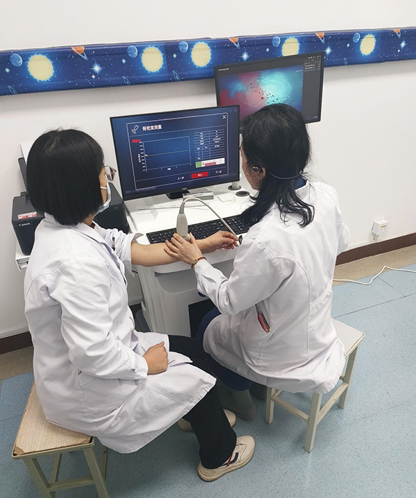 在患者體驗方面,雙屏雙探頭超聲骨密度檢測儀同樣表現出色。設備配備了主屏操作和副屏互動功能,在等待檢測結果的過程中,副屏可以實時播放健康科普動畫或舒緩音樂,這一設計不僅提升了患者的就醫體驗,也進一步增強了醫患之間的溝通與信任。